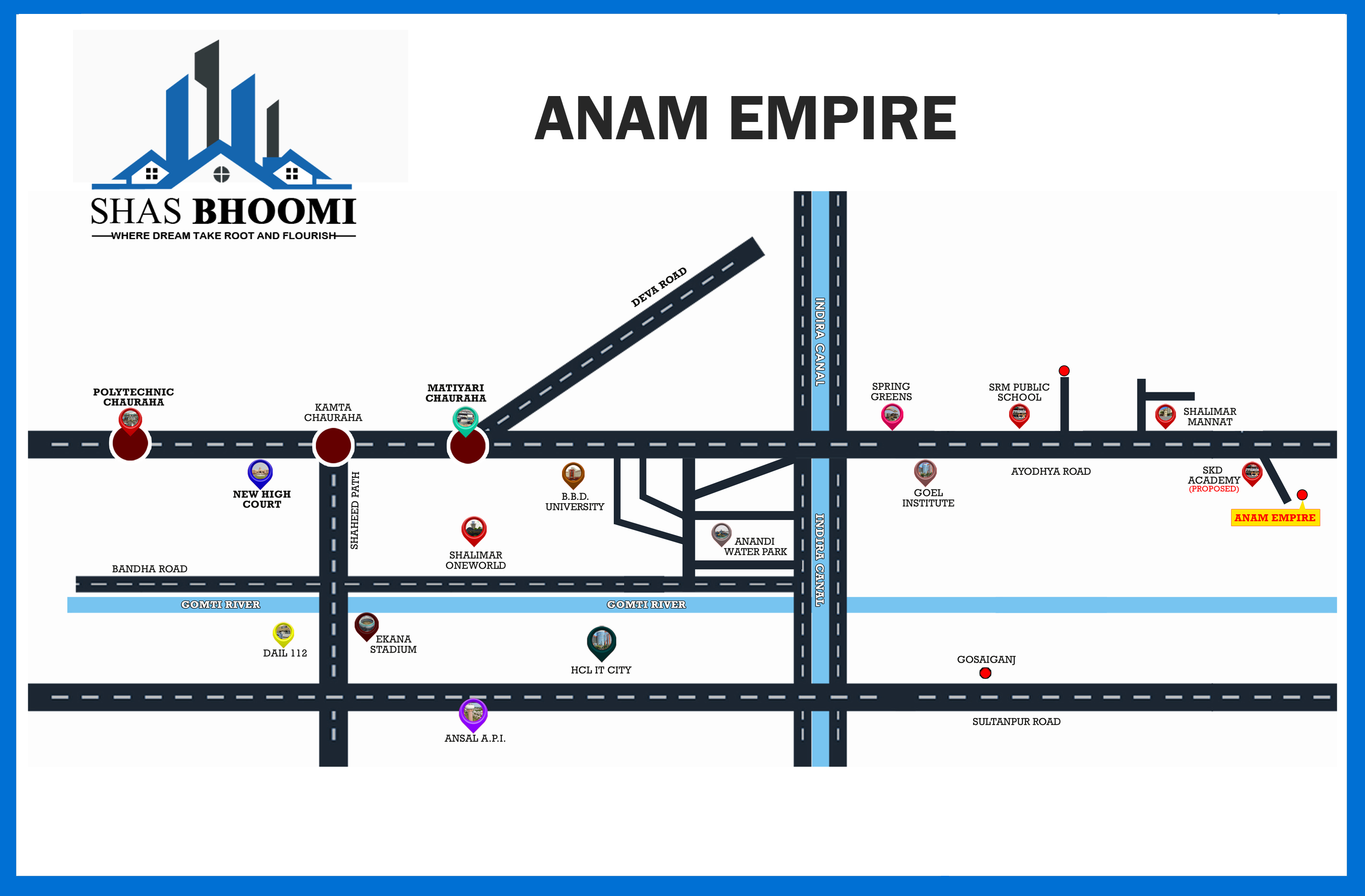 ANAM EMPIRE Project by Shas Bhoomi Pvt. Ltd. have almost prime location at Faizabad road Kisan Path, Near Anandi Water Park - Lucknow and highways of line city and have various lifestyle amenities. An Luxurious Living project by Shas Bhoomi Pvt. Ltd. located at Faizabad road Kisan Path, Near Anandi Water Park - Lucknow, ANAM EMPIRE project. A place where every moment of life is worth a celebration, a place where dreams begin to unfold, where you rediscover life's little pleasures, where happiness is nurtured in every look and corner, and above all, a place you'd be proud to call "Home".